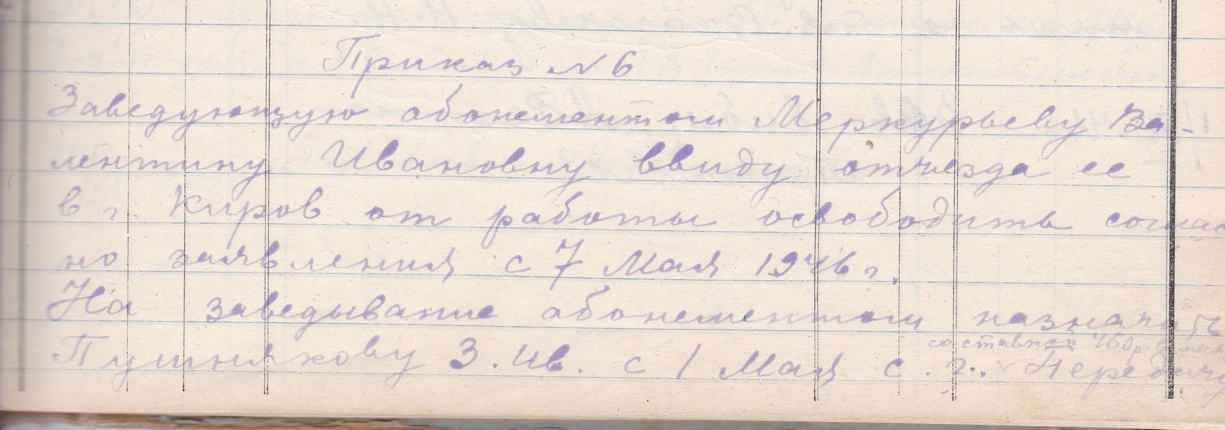 Юферицына (Пушнякова) Зоя Ивановна : приказ № 6 от 01.05.1946 года : о назначении заведующей абонементом // МБУК «Великоустюгская ЦБС». МБУК. Книга приказов №1 по С-Двинской Губернской центральной библиотеке – Великоустюгской районной библиотеке (начата 1 марта 1928 года – окончена 23 декабря 1955 года) – С. 121.