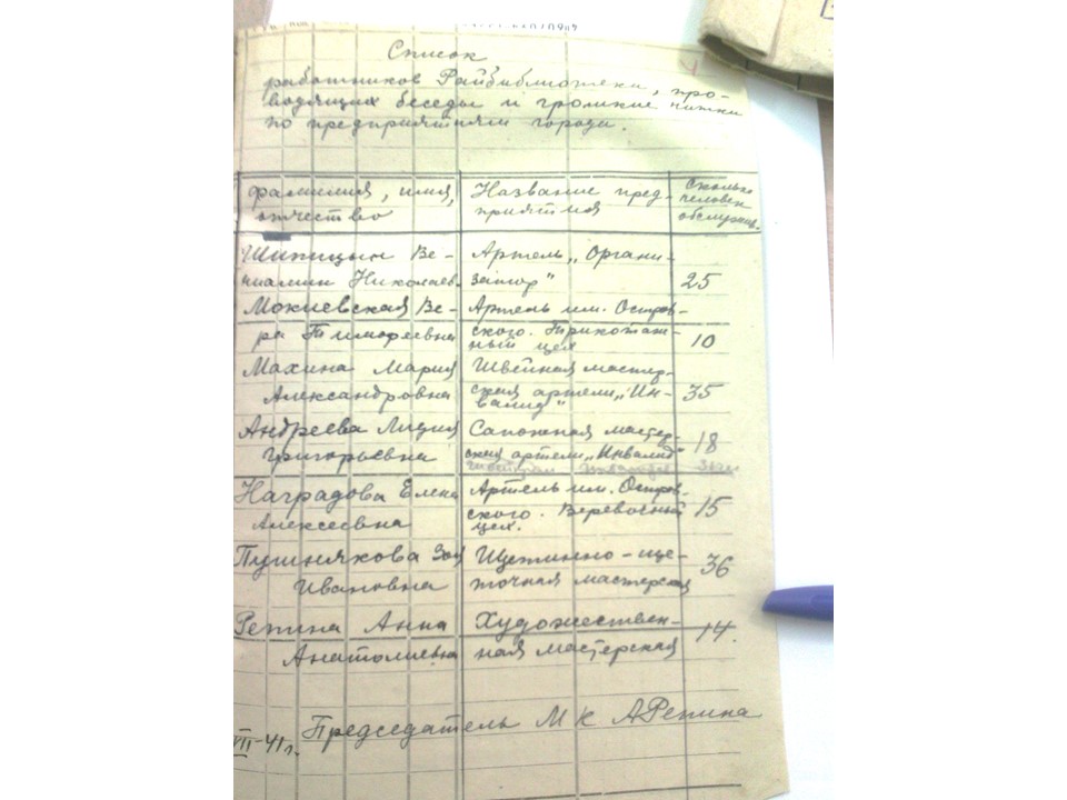 Помимо этого, оформляли книжные выставки, военно-оборонный уголок, обучались основам противовоздушной химической обороны, выходили в передвижки на предприятия города. Был организован кружок домашних хозяек по изучению военного дела.