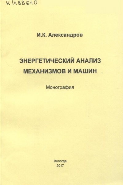 Александров, И. К. Энергетический анализ механизмов и машин : монография / И. К. Александров ; М-во образования и науки Рос. Федерации, Вологод. гос. ун-т. – Вологда : ВоГУ, 2017. – 299, [1] с. : ил., табл. – Библиогр.: с. 286-295 (156 назв.) – ISBN 978-5-87851-726-3.