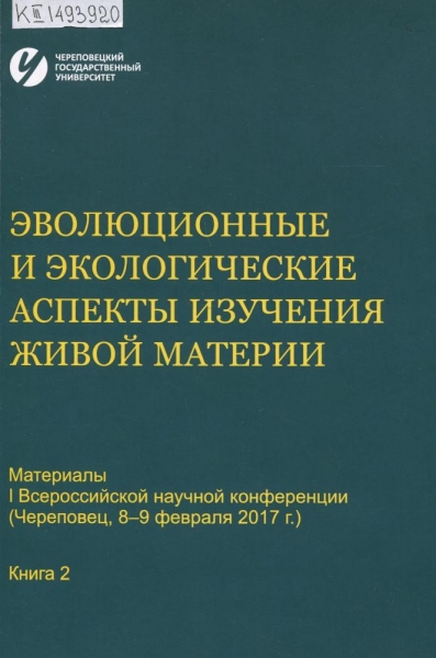 Эволюционные и экологические аспекты изучения живой материи : материалы I Всероссийской научной конференции (Череповец, 8-9 февраля 2017 г.), [посвященной памяти Н. П. Коломийцева и 20-летию образования кафедры биологии Череповецкого гос. ун-та : в 4 кн.]. Кн. 2 / [отв. ред. Н. Я. Поддубная]. – Череповец : ЧГУ, 2017. – 217 с. : ил., табл., карты. – В надзаг.: Череповец. гос. ун-т . – Рез. на англ. яз. . – Библиогр. в конце ст. – ISBN 978-5-85341-747-2. – ISBN 978-5-85341-1-751-9 (кн. 2).