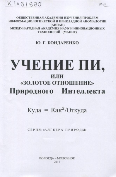Бондаренко, Ю. Г. Учение ПИ, или «Золотое отношение» природного интеллекта : [монография] / Ю. Г. Бондаренко ; Обществен. акад. изучения проблем информациолог. и приклад. аномалогии (АИПАН), Междунар. акад. наук и инновац. технологий (МАНИТ). – Вологда ; Молочное : Вологодская ГМХА, 2017. – 425, [1] с. : ил., цв. ил., табл., граф. – (Серия «Алгебра природы») – Библиогр.: с. 382-385 (82 назв.), 420-421 (41 назв.), в подстроч. примеч. и в конце некоторых ст. – Словарь: с. 352-381. – ISBN 978-5-98076-240-7.