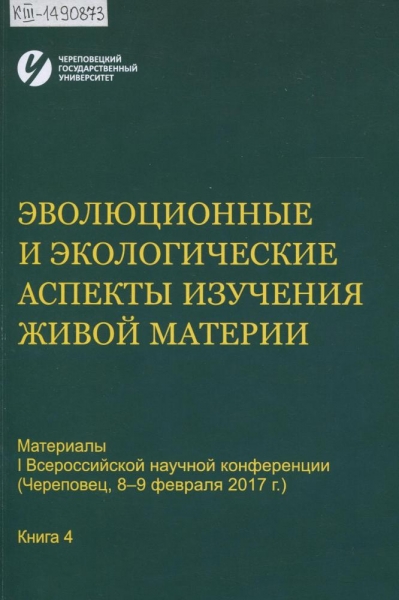 Эволюционные и экологические аспекты изучения живой материи : материалы I Всероссийской научной конференции (Череповец, 8-9 февраля 2017 г.), [посвященной памяти Н. П. Коломийцева и 20-летию образования кафедры биологии Череповецкого гос. ун-та : в 4 кн.]. Кн. 4 / Череповец. гос. ун-т ; [отв. ред. Н. Я. Поддубная]. – Череповец : ЧГУ, 2017. – 166 с. : ил. – Рез. на англ. яз. – ISBN 978-5-85341-747-2. – ISBN 978-5-85341-750-2.