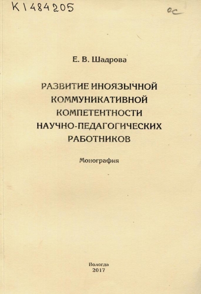Шадрова Е. В. Развитие иноязычной коммуникативной компетентности научно-педагогических работников : монография / Е. В. Шадрова ; М-во образования и науки Рос. Федерации, Вологод. гос. ун-т. – Вологда : ВоГУ, 2017. – 111 с. : ил. – Библиогр.: с. 95-101 (104 назв.). – ISBN 978-5-87851-711-9.