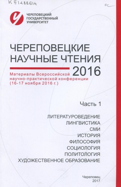 Череповецкие научные чтения – 2016 : материалы Всероссийской научно-практической конференции (16-17 ноября 2016 г.). [В 3 ч.] Ч. 1. Литературоведение, лингвистика, СМИ, история, философия, социология, политология, художественное образование / Череповец. гос. ун-т, Упр. аспирантуры, докторантуры и науч. деятельности ; [редкол.: Е. В. Целикова (отв. ред.) и др.]. – Череповец : ЧГУ, 2017. – 117 с. : ил., табл. – Библиогр. в конце ст. – ISBN 978-5-85341-735-9. – ISBN 978-5-85341-734-2.