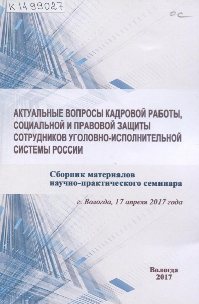 Актуальные вопросы кадровой работы, социальной и правовой защиты сотрудников уголовно-исполнительной системы России : сборник материалов научно-практического семинара (г. Вологда, 17 апреля 2017 г.) / Федер. служба исполнения наказаний, Вологод. ин-т права и экономики ; под общ. ред. А. В. Миронова, Н. А. Соколова. – Вологда : ВИПЭ ФСИН России, 2017. – 133 с. : ил., табл. – Библиогр. в подстроч. примеч. – ISBN 978-5-94991-406-9.