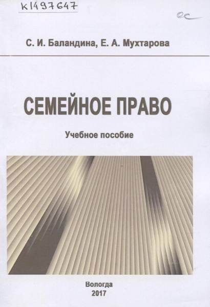 Баландина С. И. Семейное право : учебное пособие / С. И. Баландина, Е. А. Мухтарова ; Федер. служба исполн. наказаний, Вологод. ин-т права и экономики. – Вологда : ВИПЭ ФСИН России, 2017. – 168 с. – Библиогр. в конце гл. и в подстроч. примеч. – ISBN 978-5-94991-420-5.