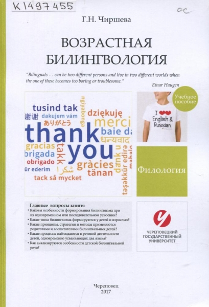 Чиршева Г. Н. Возрастная билингвология : учебное пособие / Г. Н. Чиршева ; [науч. ред. М. Г. Исаева] ; Череповец. гос. ун-т. – Череповец : ЧГУ, 2017. – 206 с. – Библиогр.: 198-206 (161 назв.). – ISBN 978-5-85341-779-3.