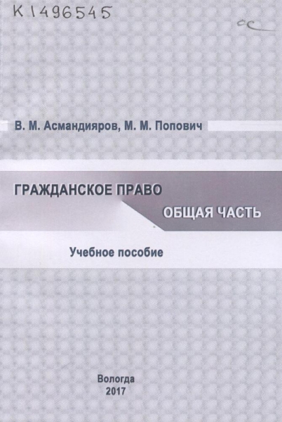 Асмандияров В. М. Гражданское право. Общая часть : учебное пособие / В. М. Асмандияров, М. М. Попович ; Федер. служба исполнения наказаний, Вологод. ин-т права и экономики. – Вологда : ВИПЭ ФСИН России, 2017. – 271 с. – Библиография в конце глав. – ISBN 978-5-94991-395-6.