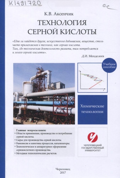 Аксенчик, К. В. Технология серной кислоты : учебное пособие / К. В. Аксенчик ; [науч. ред. А. В. Артамонов] ; Череповец. гос. ун-т, Инженер.-техн. ин-т. – Череповец : ЧГУ, 2017. – 209 с. : ил., граф., табл. – Библиогр. в конце ст. – ISBN 978-5-85341-759-5.