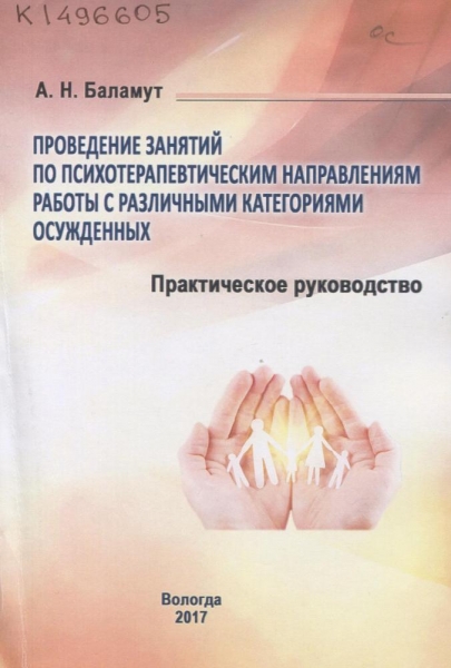 Баламут А. Н. Проведение занятий по психотерапевтическим направлениям работы с различными категориями осужденных : практическое руководство / А. Н. Баламут ; Федер. служба исполнения наказаний, Вологод. ин-т права и экономики. – Вологда : ВИПЭ ФСИН России, 2017. – 97 с. – Библиогр. в подстроч. примеч. – ISBN 978-5-94991-418-2.
