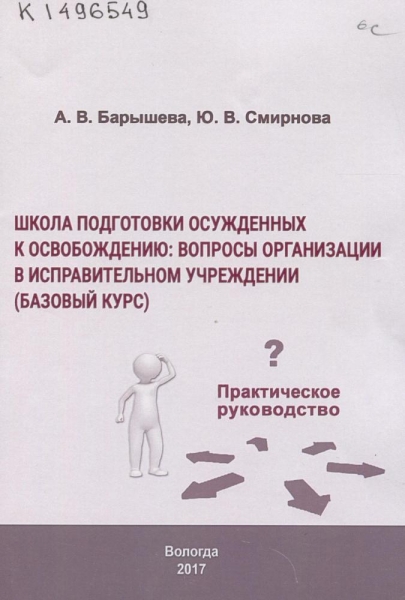 Барышева А. В. Школа подготовки осужденных к освобождению: вопросы организации в исправительном учреждении (базовый курс) : практическое руководство / А. В. Барышева, Ю. В. Смирнова ; [под ред. О. Е. Куренковой] ; Федер. служба исполнения наказаний, Вологод. ин-т права и экономики. – Вологда : ВИПЭ ФСИН России, 2017. – 284 с. : ил., табл. – Библиогр. в подстроч. примеч. – ISBN 978-5-94991-399-4.