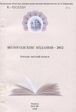 Вологодские издания - 2012 : каталог местной печати / Вологод. обл. универ. науч. б-ка им. И. В. Бабушкина ; под ред. Солодухиной Л. Н. ; [сост.: Солодухина Л. Н., Королева С. А.]. – Вологда : ВОУНБ, 2018. – 221, [2] с., [3] л. цв. ил. – Алф. указ. издательств: с. 190-202. – ISBN 978-5-904318-37-6.