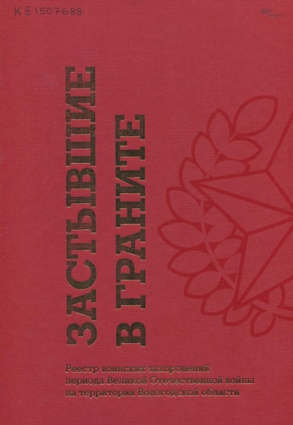 Дьяков И. А. Застывшие в граните : реестр воинских захоронений периода Великой Отечественной войны на территории Вологодской области / И. А. Дьяков, Ю. В. Щёкотова ; Вологод. обл. молодеж. обществ. орг. «Вологод. поиск. отряд». – Вологда : Арника, 2018. – 487 с. : цв. ил., ил., табл., факс. – Библиогр.: с. 487. – Имен. списки солдат и офицеров, похорон. на территории Вологод. обл.: с. 185-484. – ISBN 978-5-4429-0057-6.