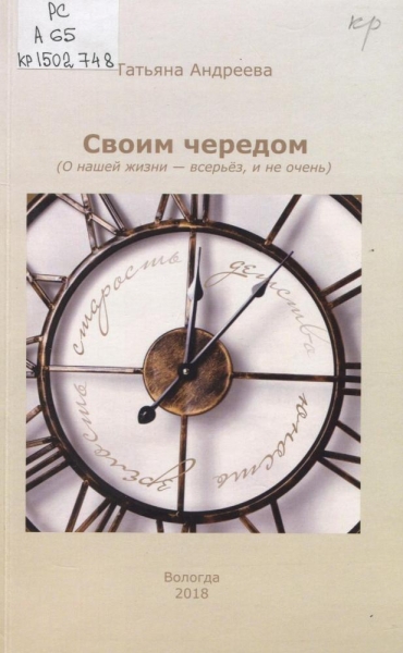 Андреева Т. А. Своим чередом : (о нашей жизни - всерьез, и не очень) / Т. Андреева. – Вологда : Киселев А. В., 2018. – 392 с. – 16+. – ISBN 978-5-906945-23-5.