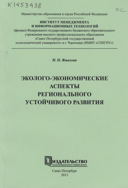 Яшалова Н. Н. Эколого-экономические аспекты регионального устойчивого развития / Н. Н. Яшалова ; [науч. ред.: Г. Л. Орлянская]; М-во образования и науки Рос. Федерации, Ин-т менеджмента и информ. технологий, (фил.) Федер. гос. бюджет. образоват. учреждения высш. проф. образования С.-Петерб. гос. политехн. ун-т в г. Череповце (ИМИТ СПбГПУ). - Санкт-Петербург : СПбГПУ, 2013. - 131 с. : ил., табл. - ISBN 978-5-7422-3955-0