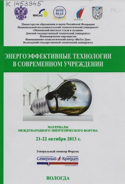 Энергоэффективные технологии в современном учреждении : материалы Международного энергетического форума, 21-22 октября 2013 г. / М-во образования и науки Рос. Федерации, Нац. исследоват. технол. ун-т «Моск. ин-т стали и сплавов» (МИСиС), Донской гос. техн. ун-т (ДГТУ), Некоммерч. партнерство Инновационно-технол. центр «ИнТех-Дон», Вологод. гос. техн. ун-т (ВоГТУ) ; [отв. ред.: Синицын А. А. ; вступит. сл.: Л. И. Соколов]. - Вологда : ВоГТУ, 2013. - 120 с. : ил., табл. - ISBN 978-5-87851-499-6