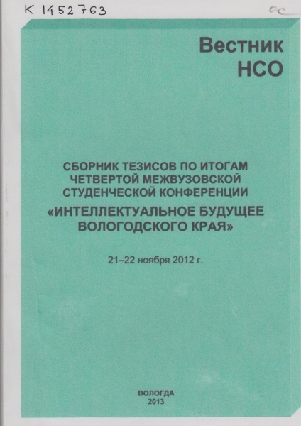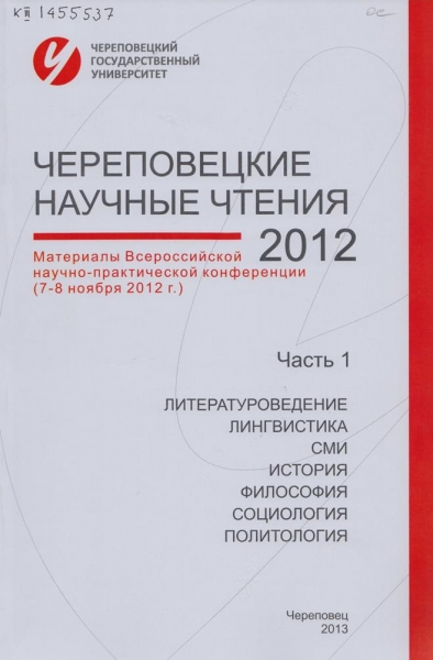 Череповецкие научные чтения - 2012. [В 3 ч.] : материалы Всероссийской научно-практической конференции (7-8 ноября 2012 г.). Ч. 1. Литературоведение, лингвистика, СМИ, история, философия, социология, политология / [редкол.: Н. П. Павлова (отв. ред.) и др.]. - Череповец : ЧГУ, 2013. - 218, [2] с. : ил., табл. - ISBN 978-5-85341-535-5. - ISBN 978-5-85341-534-8