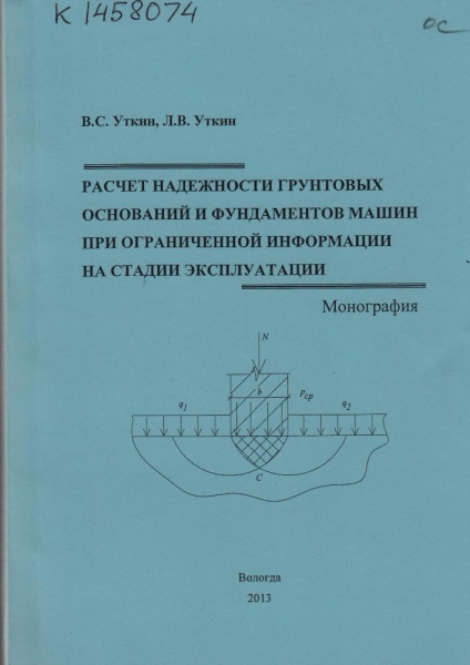 Уткин В. С. Расчет надежности грунтовых оснований и фундаментов машин при ограниченной информации на стадии эксплуатации : монография / В. С. Уткин, Л. В. Уткин ; М-во образования и науки Рос. Федерации, Вологод. гос. ун-т. - Вологда : ВоГУ, 2013. - 135 с. : ил., табл. - ISBN 978-5-87851-507-8