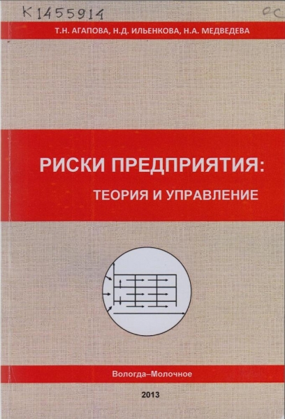 Агапова Т. Н. Риски предприятия : теория и управление : монография / Т. Н. Агапова, Н. Д. Ильенкова, Н. А. Медведева ; М-во сельского хозяйства РФ, ФГБОУ ВПО «Вологод. гос. молочнохоз. акад. им. Н. В. Верещагина», Экон. фак. Вологда ; Молочное : ИЦ ВГМХА, 2013. - 85 с. : ил., табл. - ISBN 978-5-98076-164-6