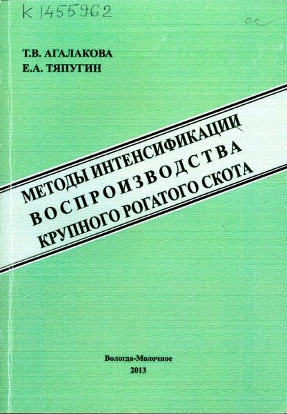 Агалакова Т. В. Методы интенсификации воспроизводства крупного рогатого скота / Т. В. Агалакова, Е. А. Тяпугин; Рос. акад. с.-х. наук, Отд-ние зоотехнии, Зонал. науч.-исслед. ин-т сел. хоз-ва Северо-Востока им. Н. В. Рудницкого, Сев.-Зап. науч.-исслед. ин-т молоч. и лугопастбищ. хоз-ва. - Вологда : ВГМХА, 2013. - 215 с. : ил., табл. - ISBN 978-5-98076-163-9
