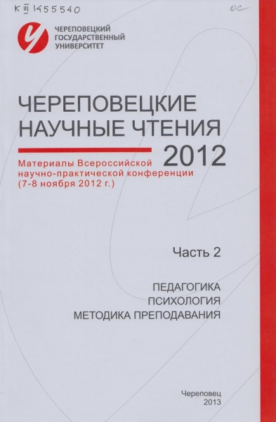 Череповецкие научные чтения - 2012. [В 3 ч.] : материалы Всероссийской научно-практической конференции (7-8 ноября 2012 г.). Ч. 2. Педагогика, психология, методика преподавания / [редкол.: Н. П. Павлова (отв. ред.) и др.]. - Череповец : ЧГУ, 2013. - 251, [3] с. : ил., табл. - ISBN 978-5-85341-536-2. - ISBN 978-5-85341-534-8