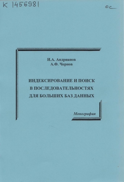 Андрианов И. А. Индексирование и поиск в последовательностях для больших баз данных : монография / И. А. Андрианов, А. Ф. Чернов ; М-во образования и науки Рос. Федерации, Вологод. гос. ун-т. Вологда : ВоГУ, 2013. - 167 с. : ил., табл. - ISBN 978-5-87851-503-0