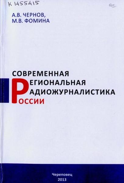Чернов А. В. Современная региональная радиожурналистика России : учебное пособие / А. В. Чернов, М. В. Фомина ; М-во образования и науки Российской Федерации, Череповецкий гос. ун-т, Гуманит. ин-т. - Череповец : ЧГУ, 2013. - 122 с. : ил., табл. - ISBN 978-5-85341-546-1