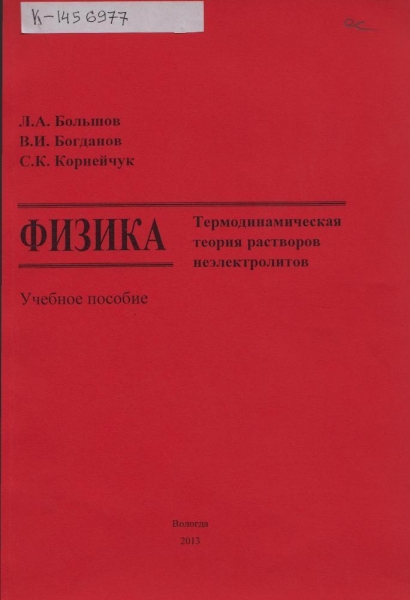 Большов Л. А. Физика. Термодинамическая теория растворов неэлектролитов : учебное пособие / Л. А. Большов, В. И. Богданов, С. К. Корнейчук ; Вологод. гос. ун-т. - Вологда : ВоГУ, 2013. - 139 с. - ISBN 978-5-87851-515-3