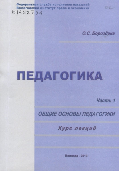 Бороздина О. С. Педагогика. [В 3 ч.] : курс лекций. Ч. 1. Общие основы педагогики / О. С. Бороздина ; Федер. служба исполн. наказаний, Вологод. ин-т права и экономики. - Вологда : ВИПЭ ФСИН России, 2013. - 211 с. : табл. - ISBN 978-5-94991-248-5