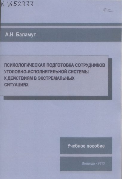 Баламут А. Н. Психологическая подготовка сотрудников уголовно-исполнительной системы к действиям в экстремальных ситуациях : учебное пособие / А. Н. Баламут ; Федер. службы исполн. наказаний, Вологод. ин-т права и экономики. - Вологда : ВИПЭ ФСИН России, 2013. - 83 с. : ил., табл. - ISBN 978-5-94991-229-4
