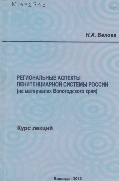 Белова Н. А. Региональные аспекты пенитенциарной системы России (на материалах Вологодского края) : курс лекций / Н. А. Белова ; Федер. служба исполн. наказаний, Вологод. ин-т права и экономики. - Вологда : ВИПЭ ФСИН России, 2013. - 194 с. - ISBN 978-5-94991-239-3