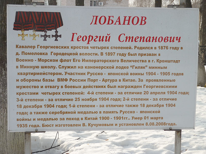 Лобанов Георгий Степанович (02.05.1876 – 01.03.1935)Родился 2 мая 1876 года в деревне Помеловка Городецкой волости Никольского уезда, впоследствии Городецкого сельсовета Кичменгско-Городецкого района. В 1897 г. был призван в Военно-морской флот в г. Кронштадт в Минную школу. Служил на канонерской лодке «Гиляк» минным квартирмейстером. Участник Русско-японской войны 1904-1905 годов и обороны базы ВМФ России Порт-Артура в Китае. Г.С. Участвовал в подавлении «боксерского» восстания, повседневной дозорной службе и боях на море под Порт-Артуром, а затем был включен в состав десантного отряда и принял участие в обороне крепости на сухопутном фронте. При сдаче Порт-Артура он был взят в плен и вернулся на родину только после окончания войны. Полный Георгиевский кавалер. В 1930-е годы работал директором льнозавода, однако льнозавод был уничтожен пожаром, а Г.С. Лобанов был осужден за халатность и получил лагерный срок. После возвращения домой прожил недолго, умер 1 марта 1935 года. Лобанов Георгий Степанович (02.05.1876 – 01.03.1935) // Гордость земли Кичменгско-Городецкой / сост. П.М. Лукин, И.О. Еремеева, Т.А. Погудина. – Вологда, 2013. – С. 38-39. Лобанов Георгий (Егор) Степанович (02.05.1876 – 01.03.1935) // Герои Вологодчины : энцикл. словарь биографий. – Вологда, 2011. – С. 25-26 : фот. |