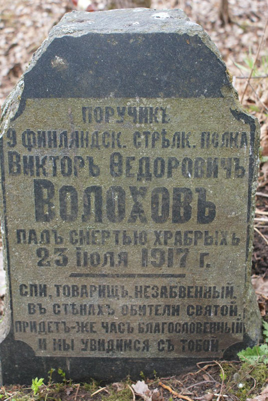 Волохов Виктор Федорович (? – 23.07.1917)Родился в деревне Лобково Вологодского уезда. Участник Первой мировой войны. Георгиевский кавалер. Был ранен. Лечился в Царскосельском лазарете. 23 июля 1917 года в чине поручика 9 Финляндского стрелкового полка погиб и был похоронен на родине. Памятник герою Первой мировой // Маяк. – Вологда, 2013. – 9 ноября. – С. 2. В деревне Спас Вологодского района 11 ноября откроется восстановленный памятник поручику 9-го Финляндского стрелкового полка, погибшему в годы Первой мировой войны. |