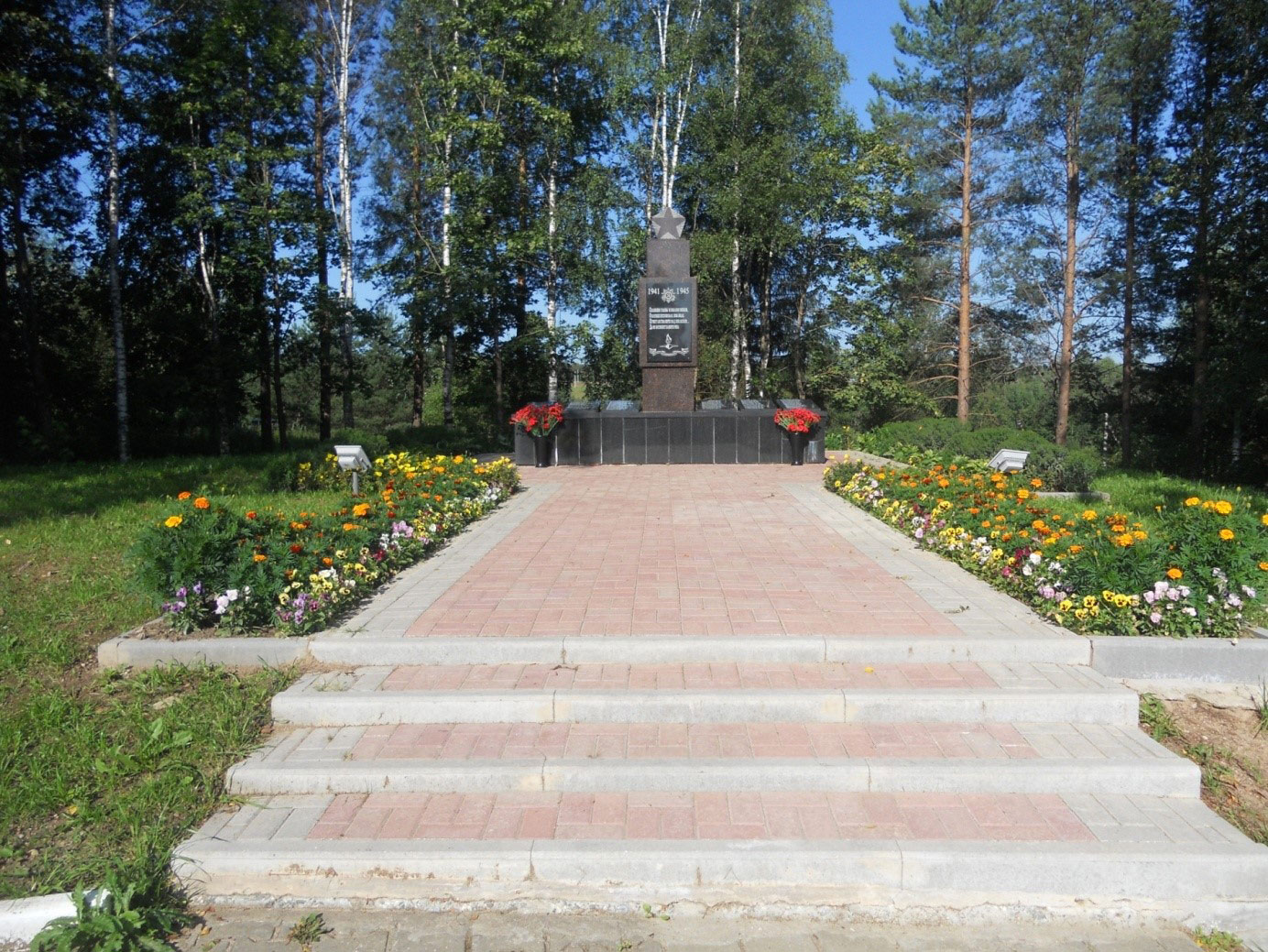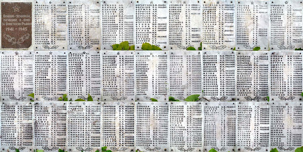 Уже в наши дни постамент был обнесен плиткой, вокруг были посажены голубые ели и сосны. Справа и слева вдоль дорожки, ведущей к памятнику, установлены 44 гранитные таблички с именами и фамилиями земляков, погибших в годы Великой Отечественной войны. Всего 440 имен (фото №2).