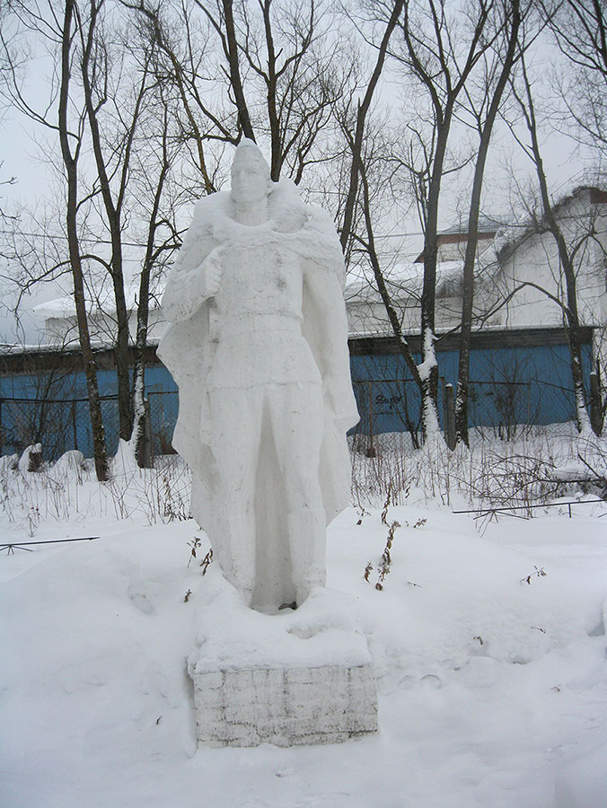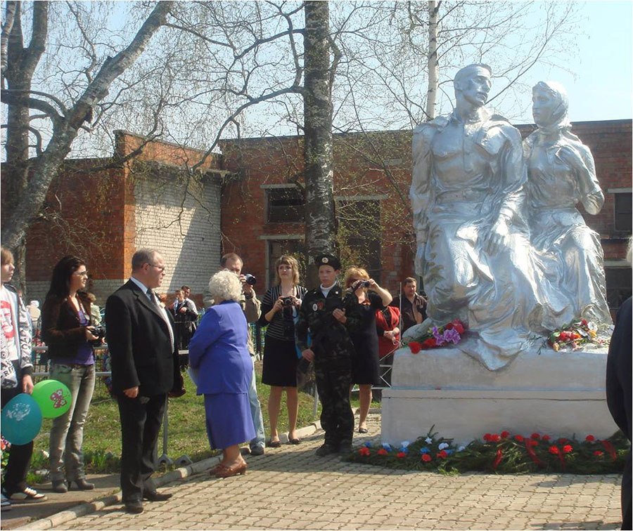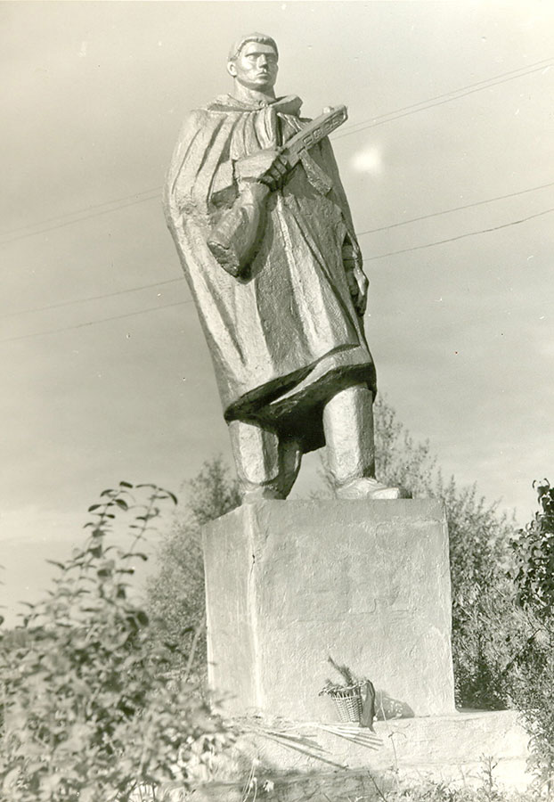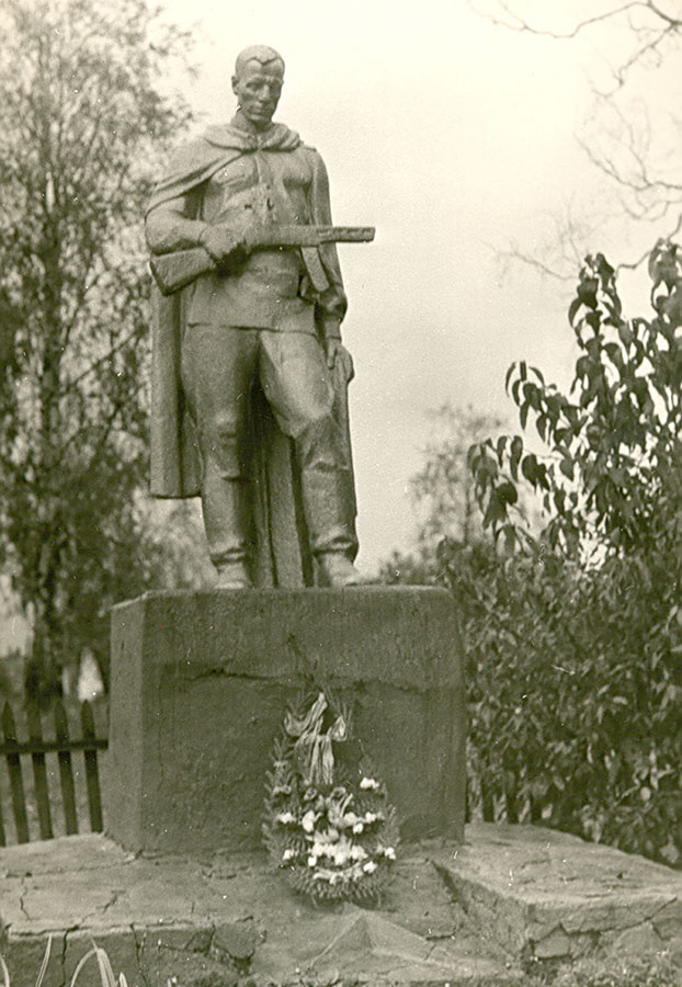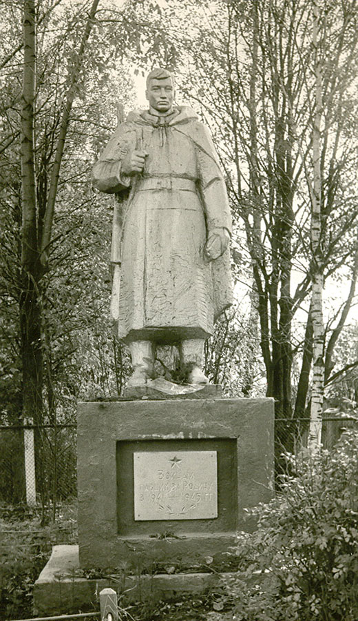 В 1995 г. к 50-летию Великой Победы обелиск был заменен памятником, изготовленным в Санкт-Петербурге (фото №8). В центре монумента – обессиленный воин, в ногах которого находится опущенный автомат. Справа, словно подставляя свое плечо, его поддерживает девушка в косынке. На лице сострадание, левая рука, прижатая к груди, передает душевную боль.