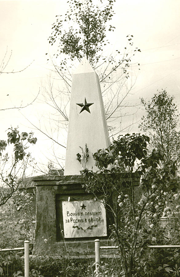 В 1974 году на месте обелиска был поставлен памятник воинам-землякам, погибшим в годы Великой Отечественной войны, изготовленный на бюджетные средства и пожертвования местных жителей. Изготовлен он был на Московском экспериментальном заводе. В начале установки памятника на данном месте была выкопана яма глубиной 2 м, далее она была заполнена камнями и залита бетоном. Постамент представлял собой кирпичную кладку, покрытую штукатуркой. Позднее был обшит вагонкой (фото №2).