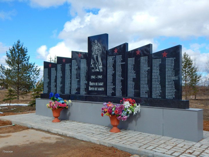 Торжественная церемония открытия нового мемориала воинам-землякам, погибшим в годы Великой отечественной войны прошла 5 мая 2017 года в поселке Плоское. На центральной стеле памятника фигура воина-освободителя и надпись «1941-1945. Никто не забыт, ничто не забыто». (фото №3). На шести обрамляющих её мраморных плитах высечены имена 350 погибших в годы Великой Отечественной войны земляков. У подножия нового мемориала высажены голубые ели и бересклеты, обустроена пешеходная дорожка, вдоль неё уложен плиточный бордюр с закладкой по обеим сторонам цветника. |