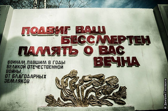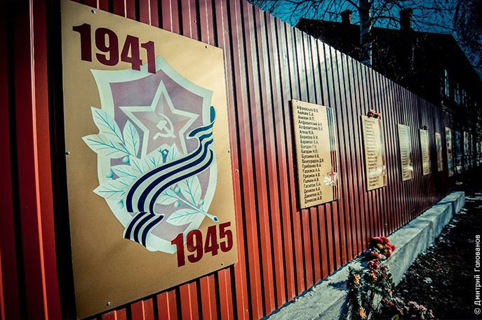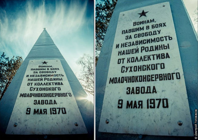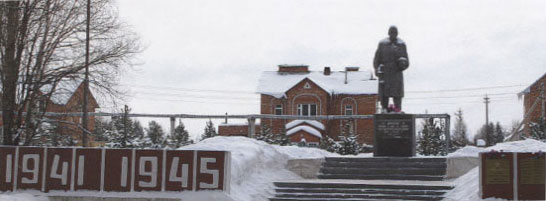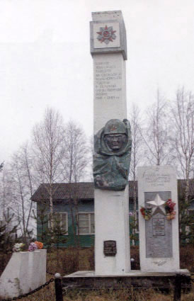 «В центре мемориального комплекса четырехметровая фигура солдата в плащ-палатке, вкинувшего вверх руки в радостном порыве. Победа! Левая рука ещё сжимает автомат. А в правой – развевающееся полотнище. Солдат-победитель, солдат, спавший мир от фашизма. Сколько таких же, как он, не дожили до Победы.294 фамилии выбиты на стеле. Это фамилии работников лесозавода № 40 (ныне ЛДК) и ДОЗ-21, не вернувшихся с полей Великой Отечественной войны.