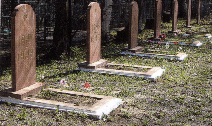 Памятник выложен светло-серой плиткой. На стеле мемориальная плита с именами похороненных солдат и суровые даты военного времени «1941-1945».