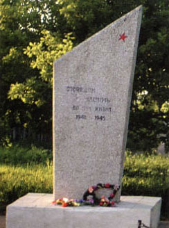 По бокам бетонной стелы барельефы. С одной стороны – бойцы, запечатленные в порыве атаки. С другой стороны стелы группа скорбящих – матери, жены, осиротевшие дети. В центре слова: «Подвиг ваш бессмертен. Память о вас вечна. Воинам, павшим в годы Великой Отечественной войны от благодарных потомков».