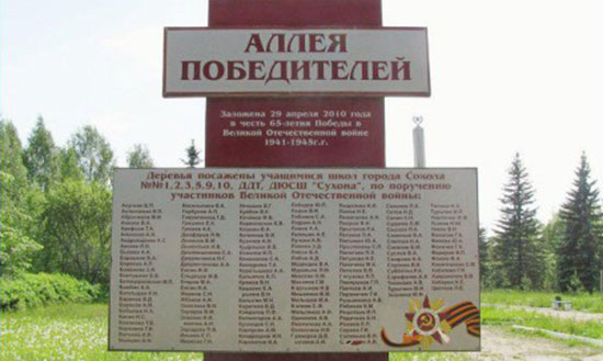 По обе стороны от памятного знака школьники высадили 162 сосенки. Число саженцев выбрано не случайно – именно столько в Сокольском районе осталось в живых участников Великой Отечественной войны. Их имена занесены на памятную доску, которая открывается надписью: «Деревья посажены учащимися школ города Сокола № 1, 2, 3, 5, 9,10, Дома детского творчества, детской юношеской спортивной школы «Сухона» по поручению ветеранов Великой Отечественной войны»