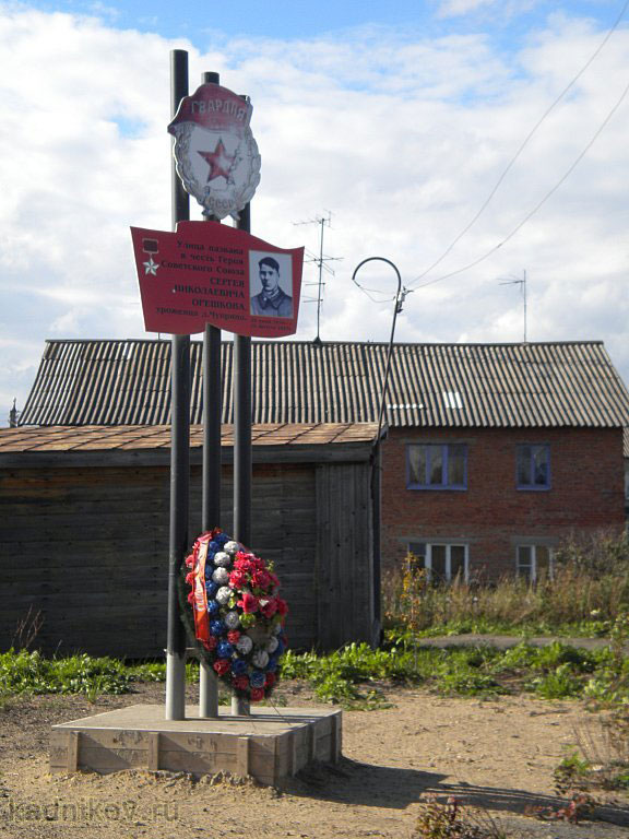 На стеле изображение гвардейского знака, а на красном полотнище, символизирующем знамя, надпись: «Улица названа в честь героя советского Союза Сергея Николаевича Орешкова. Уроженец деревни Чуприно».