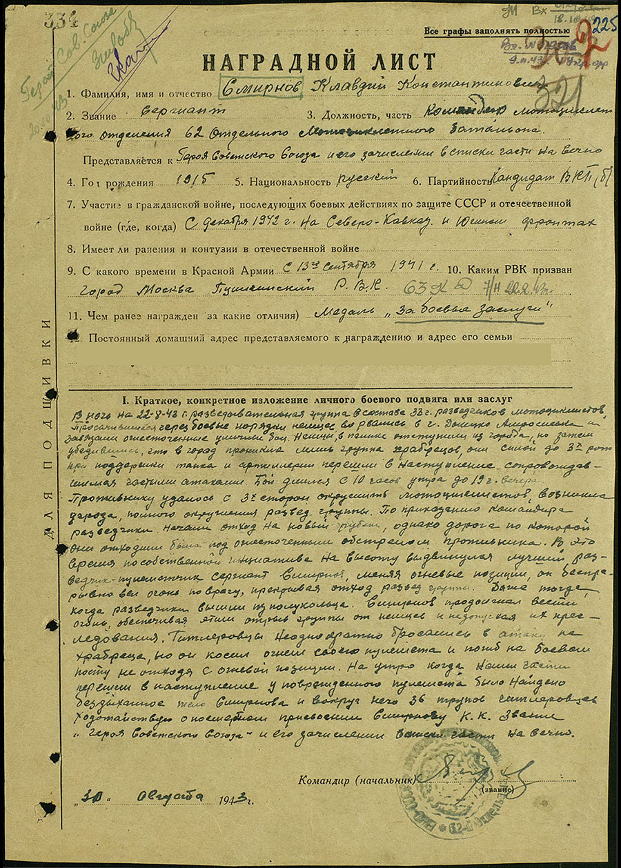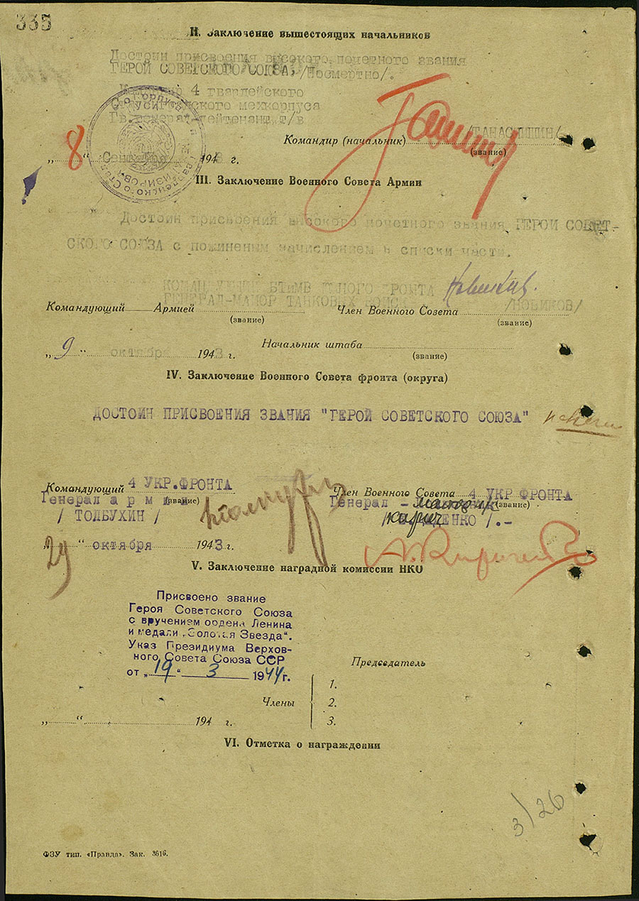 Звание Героя Советского Союза присвоено 19 марта 1944 года
