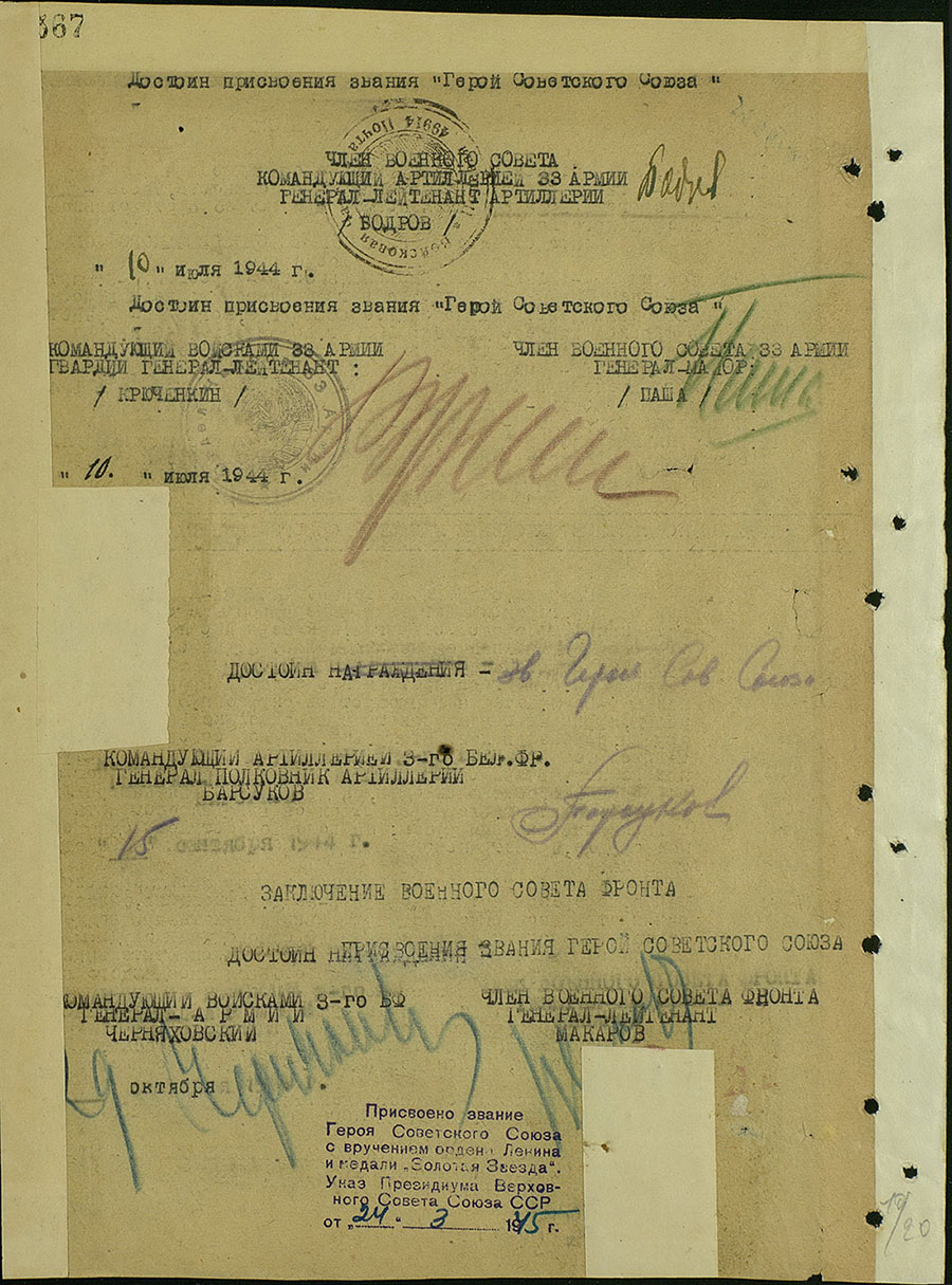 Звание Героя Советского Союза присвоено 24 марта 1945 года