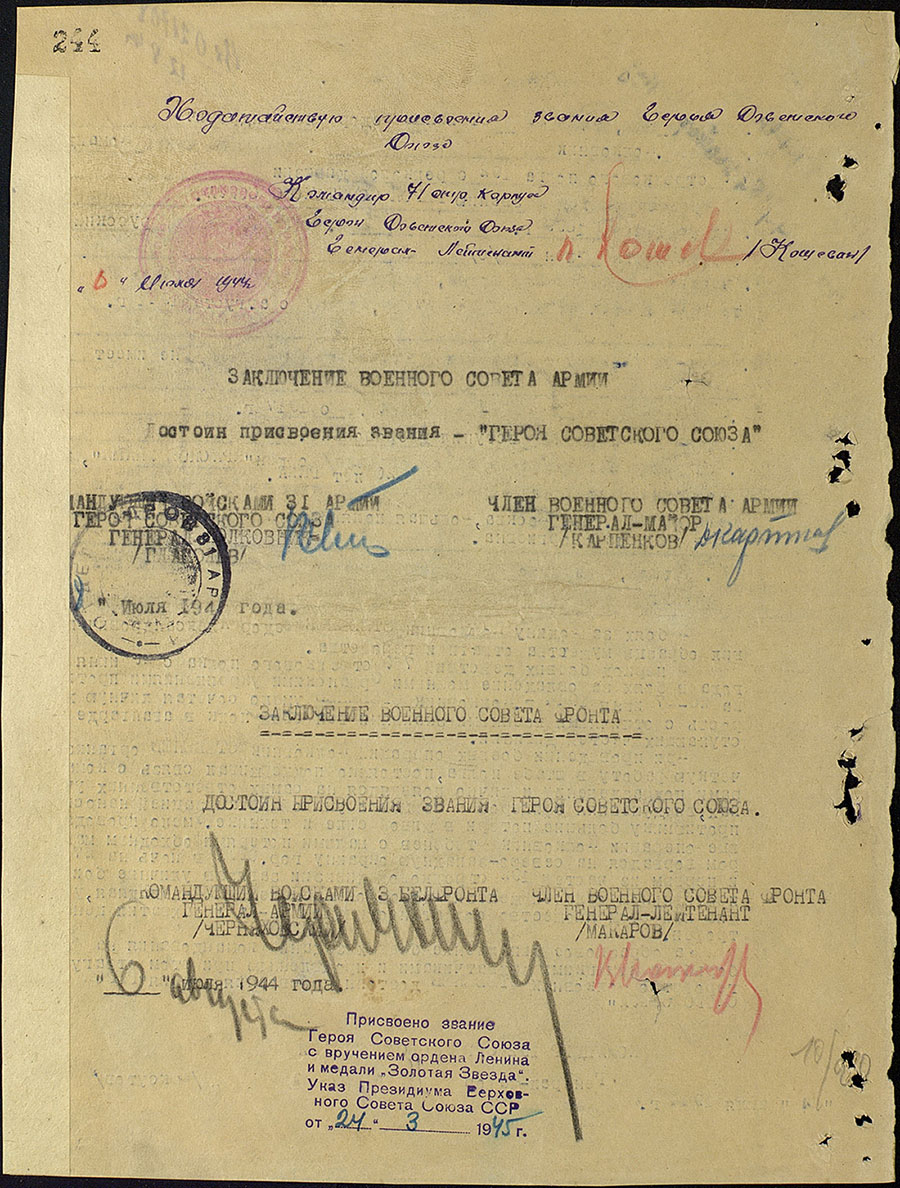 Звание Героя Советского Союза присвоено 24 марта 1945 года