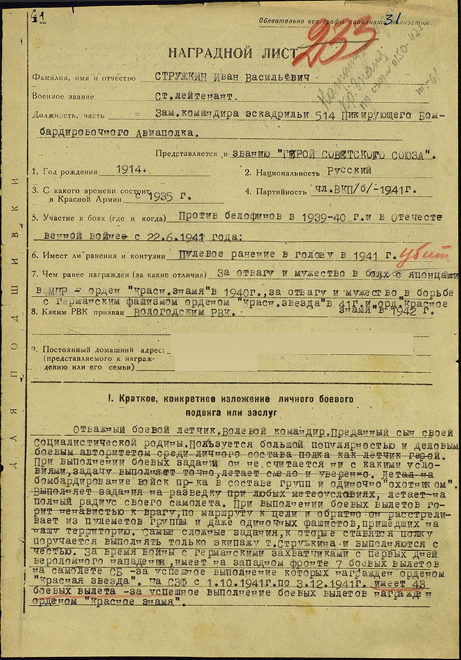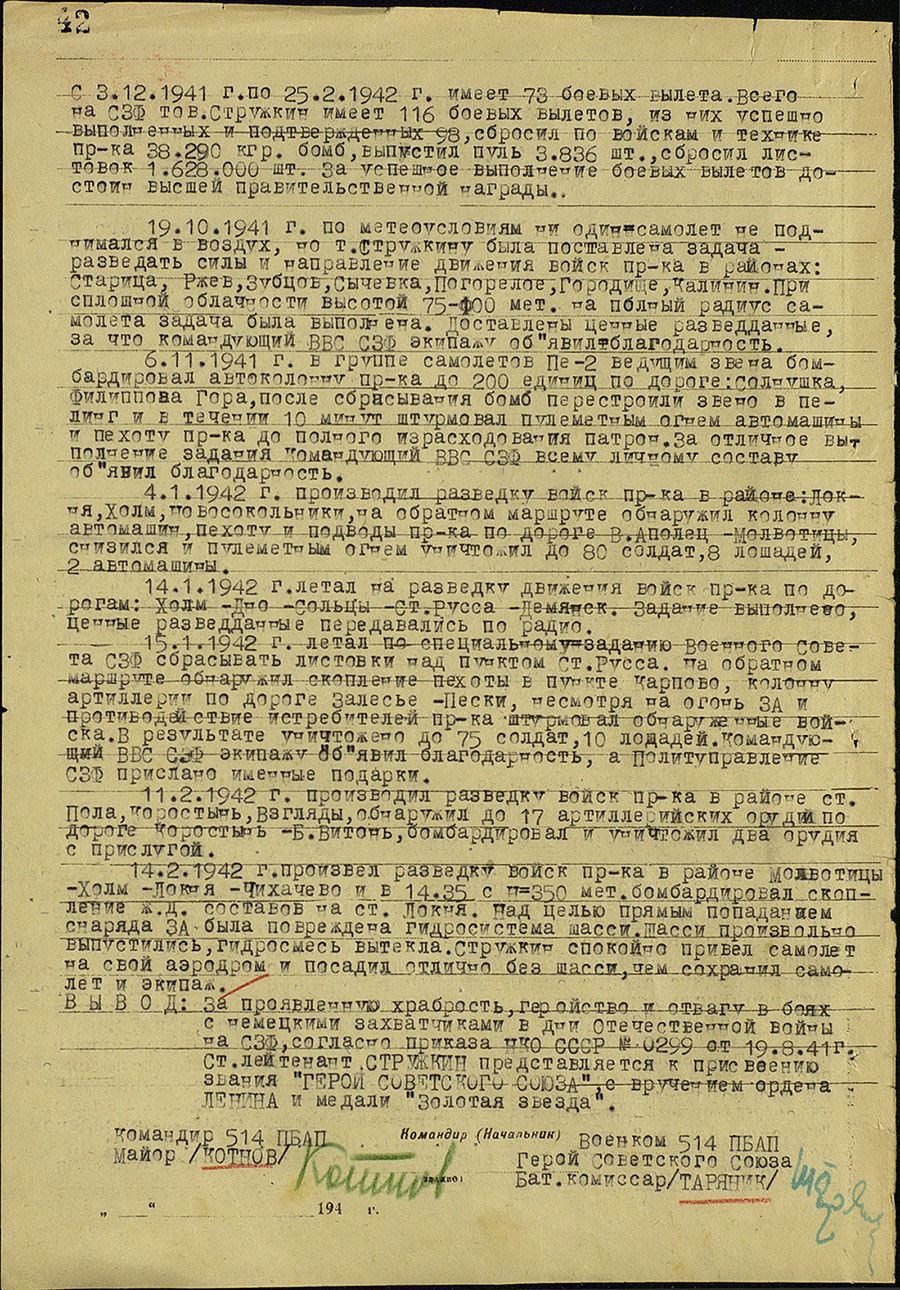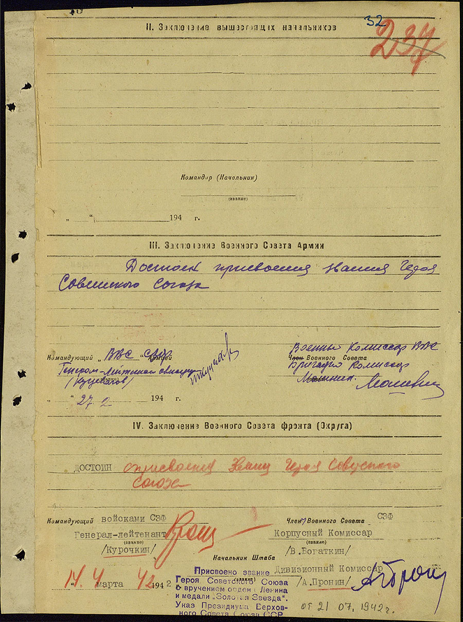 Звание Героя Советского Союза присвоено 21 июля 1942 года