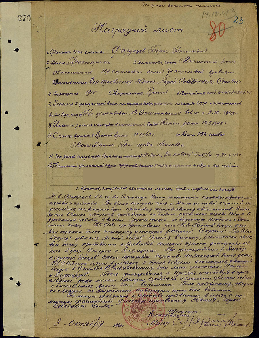 Звание Героя Советского Союза присвоено 16 октября 1943 года