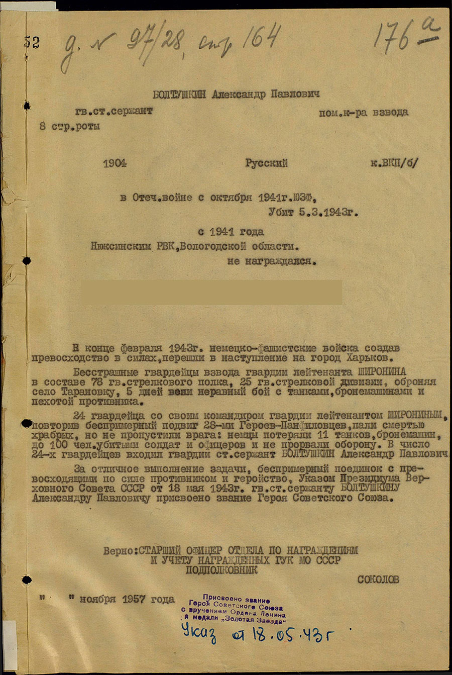 Болтушкин Александр Павлович : [краткая биография] // Герои Советского Союза : кр. биогр. слов. Т. 1 / редкол. : И.Н. Шкадов и др. – М., 1987. – С. 182.