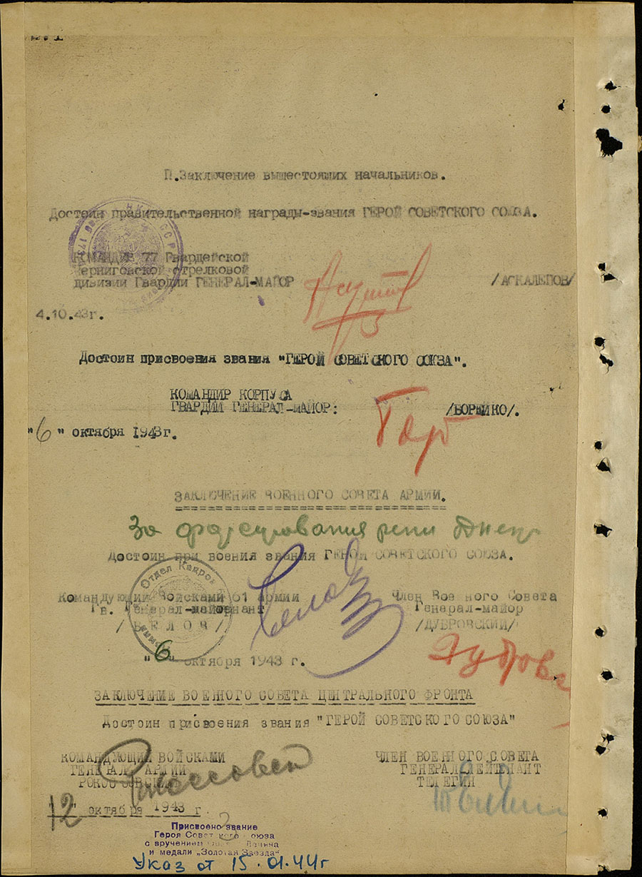 Звание Героя Советского Союза присвоено 15 января 1944 года