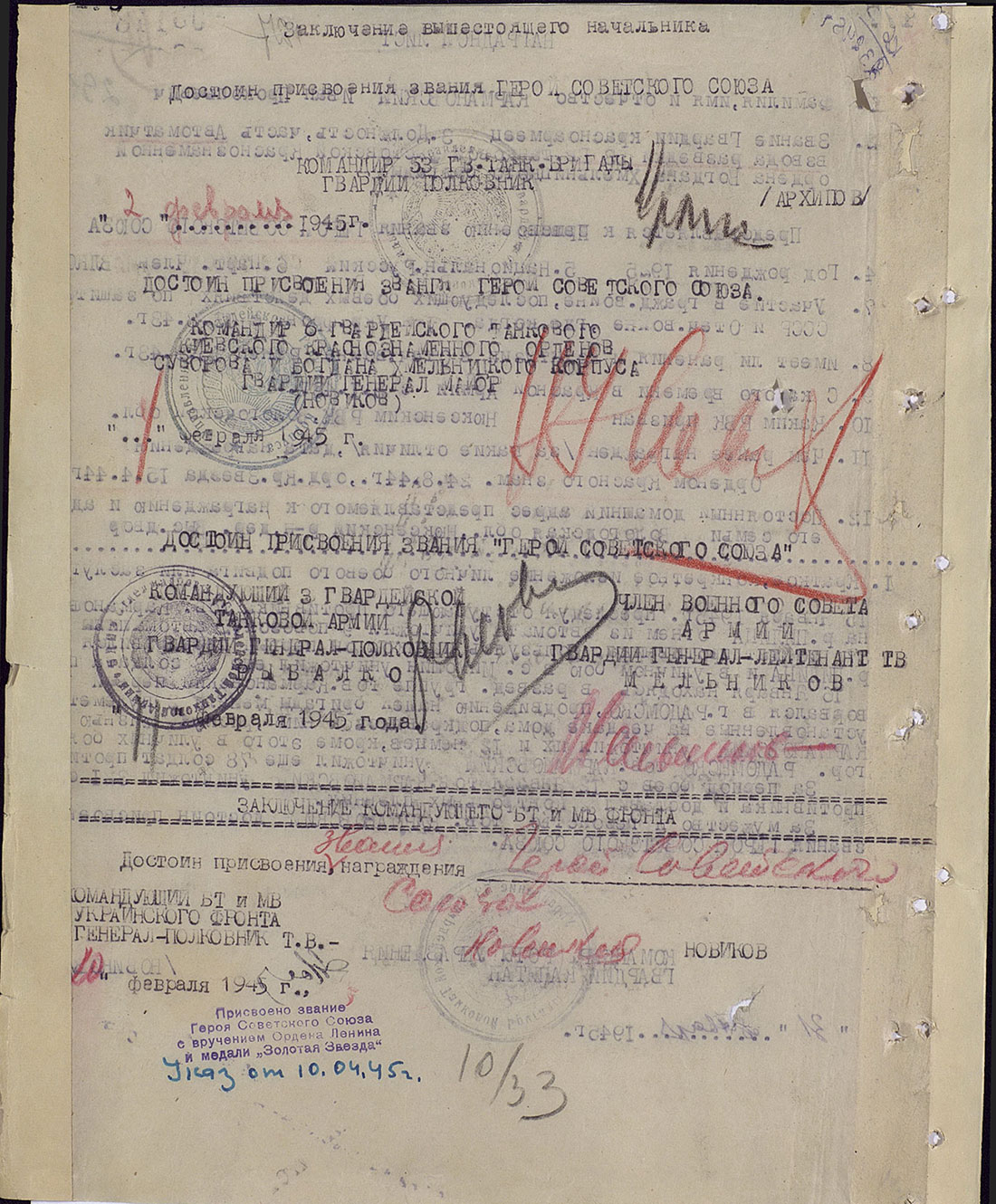Звание Героя Советского Союза присвоено 10 апреля 1945 года